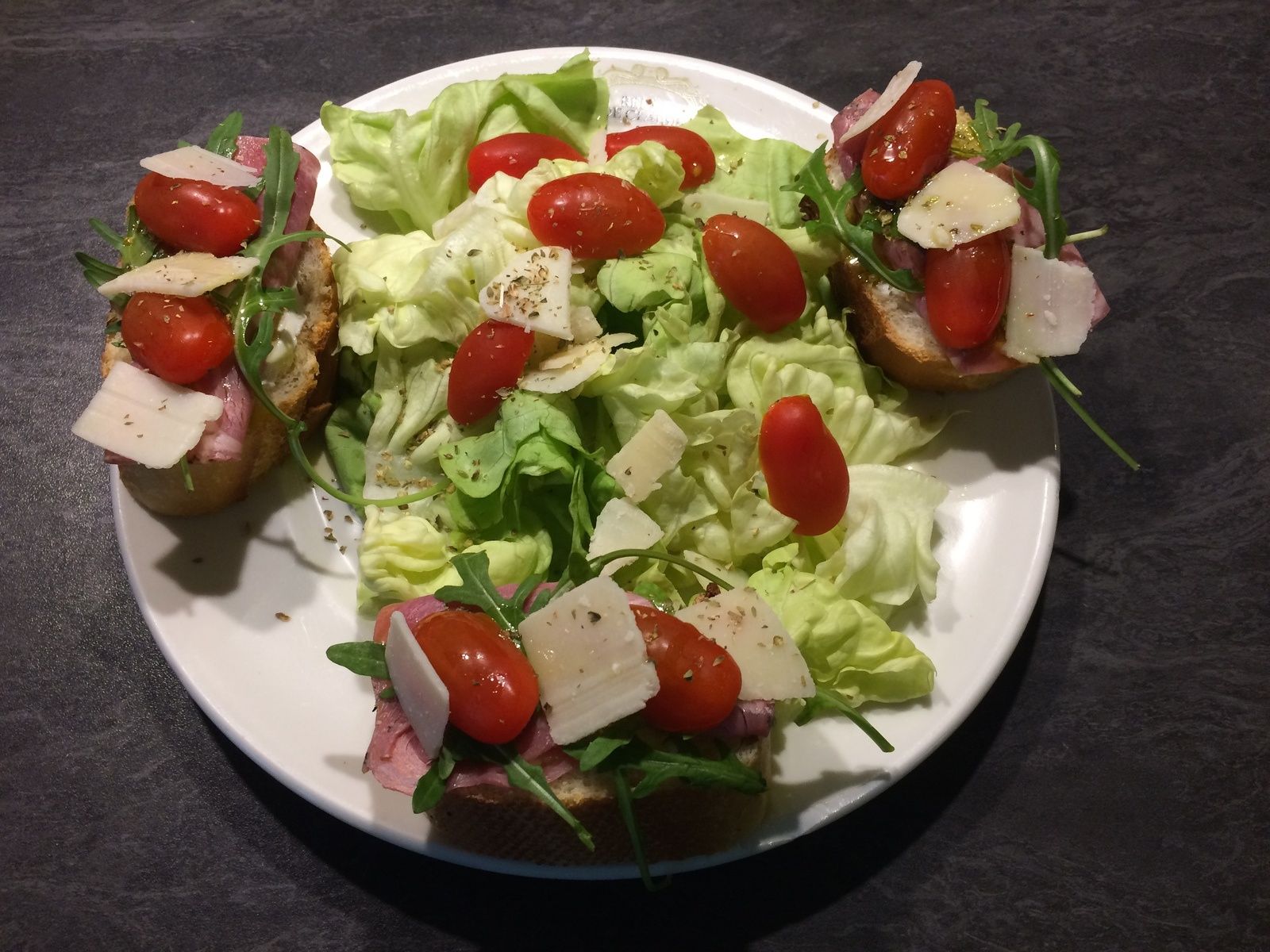 Tartiner les tranches de pain de fromage frais, déposer une tranche de coppa dessus, déposer quelques pousses de roquette, une tomate cerise coupée en deux sur chaque tartine, quelques copeaux de parmesan.
