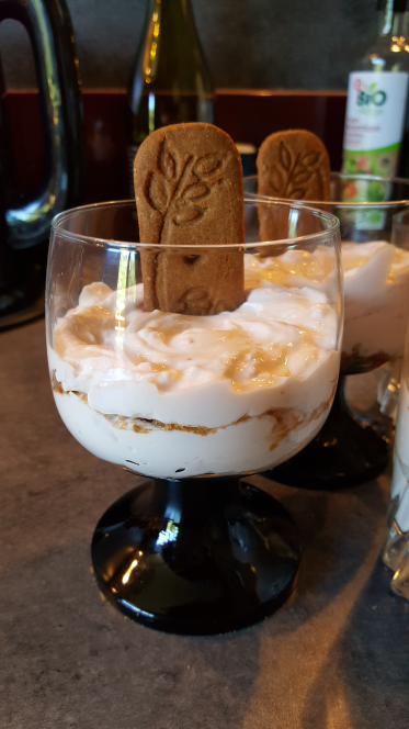 Dans 5 verres, mettre un peu de poudre de gâteaux, verser une couche de crème, à nouveau une couche de biscuits émiettés, à nouveau une couche de crème et terminer en enfonçant un biscuit entier sur le dessus.